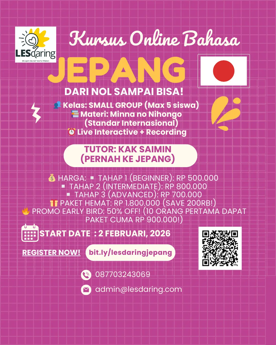 Dari Nol Sampai Bisa !Selamat datang di pendaftaran Kursus Bahasa Jepang Online bersama Kak Saimin! π π Small Group (Max 5 siswa) π Materi: Minna no Nihongo πΉ Live Interactive + Recording π Start: 2 Februari 2026 π₯ EARLY BIRD: 50% OFF untuk 10 pendaftar pertama! Paket lengkap hanya Rp 900.000 (hemat Rp 900.000!) Isi formulir berikut dengan lengkap. Tim kami akan menghubungi Anda dalam 1x24 jam untuk konfirmasi. Pertanyaan? Hubungi: π± WhatsApp: 087703243069 π§ Email: admin@lesdaring.com